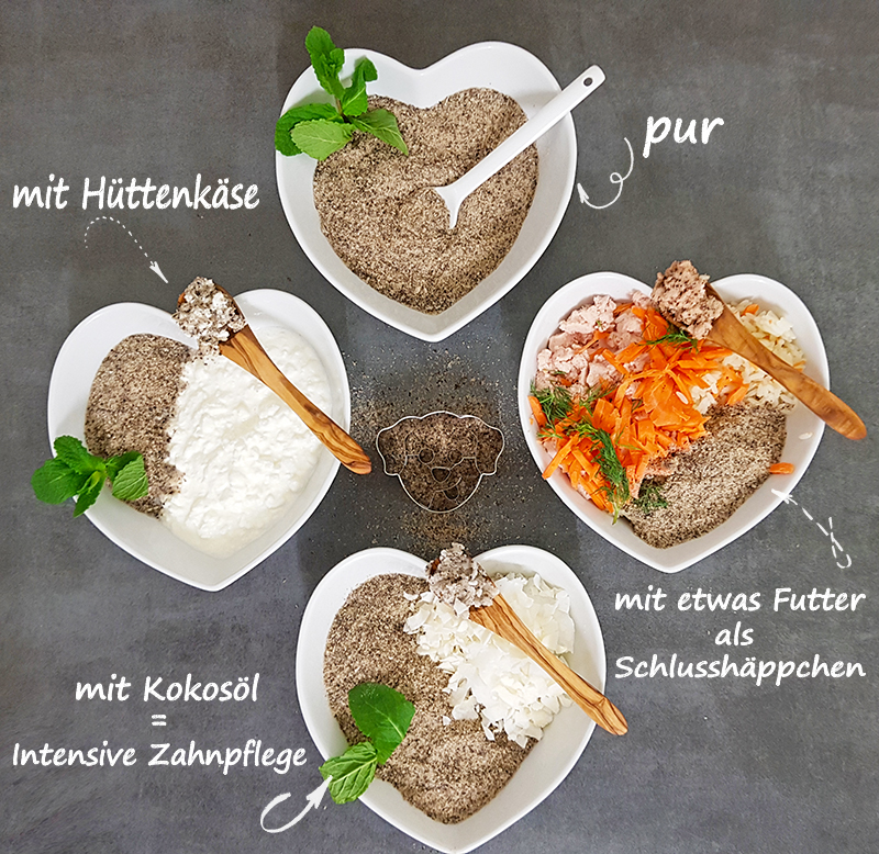 Zahnputzflocken lieben alle Hunde. Sie sind Zahnbürste und Zahnsteinentferner für alle Hunde – ob zu groß – zu alt – zu sensitiv- oder auch für die, die sonst nichts mögen – abends 1 TL pur, angefeuchtet als Nachtisch zum Aufschlecken oder auch mit 3 TL Futter mischen als Schlusshäppchen vor dem Schlafen. Es muss einen Weile im Maul bleiben, damit es wirken kann.
